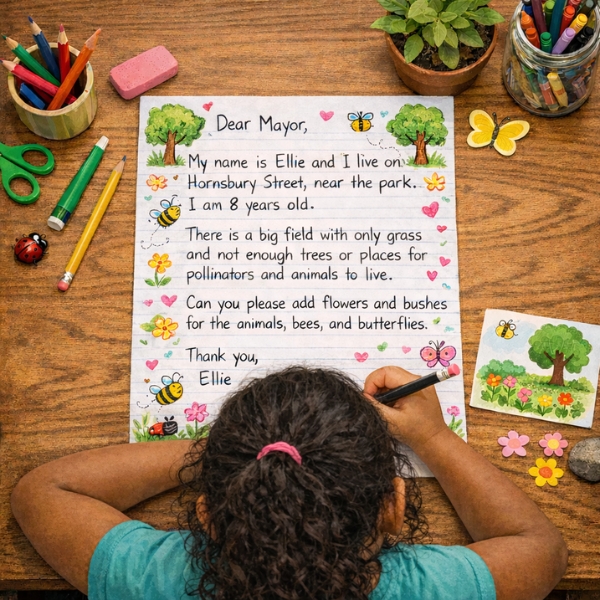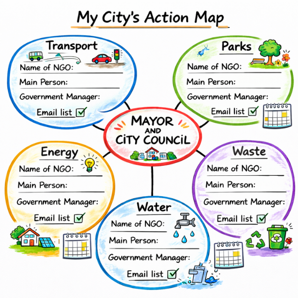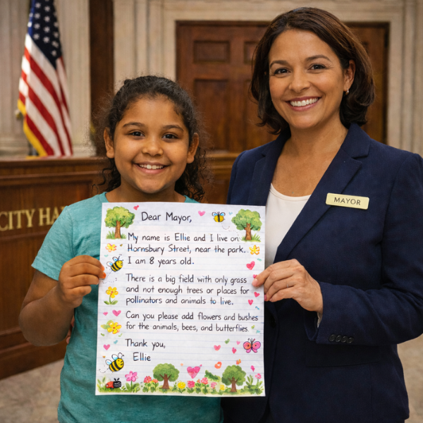 Students meet their local mayor to read their letters for green ideas and experience the process of civic advocacy.