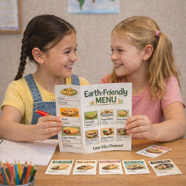 In Week 11, students calculate the environmental impact of different meals using a food emissions calculator. They rank meals by climate impact, compete to create the most eco-friendly meal, and design their own Earth-friendly menu.
