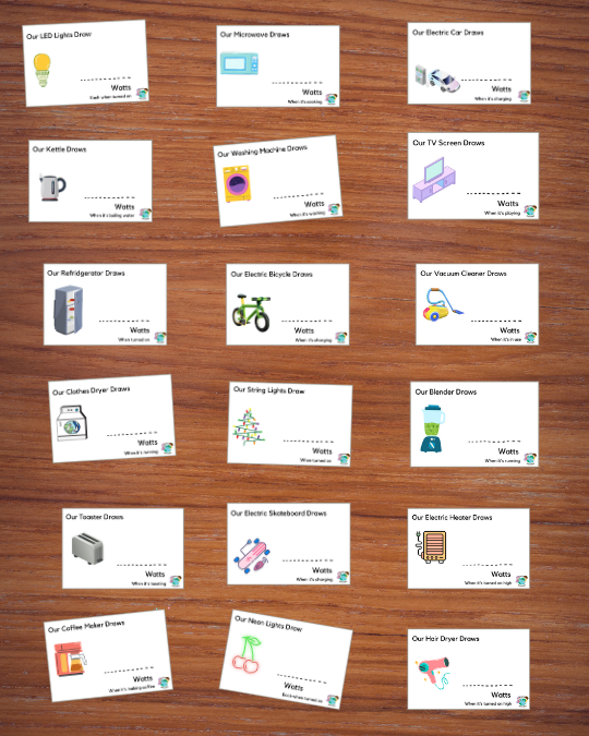 Printable cards for 33 home appliances. Stick them on appliances around the home or use in the classroom to compare wattage.